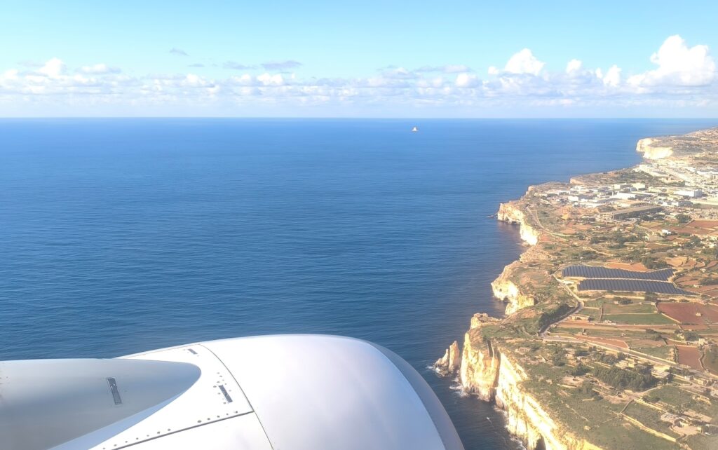 Po štarte sme sa natočili tak, že bolo krásne vidieť celú Maltu, leteli sme ďalej ponad Comino, Gozo a po chvíli sme opäť míňali Sicíliu a bafkajúcu Etnu.