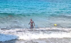 Keď sme zaparkovali na parkovisku a zbehli po schodíkoch dolu k pláži, o to viac nás prekvapil lokálny Aquaman, práve sa brodiaci z mora von.