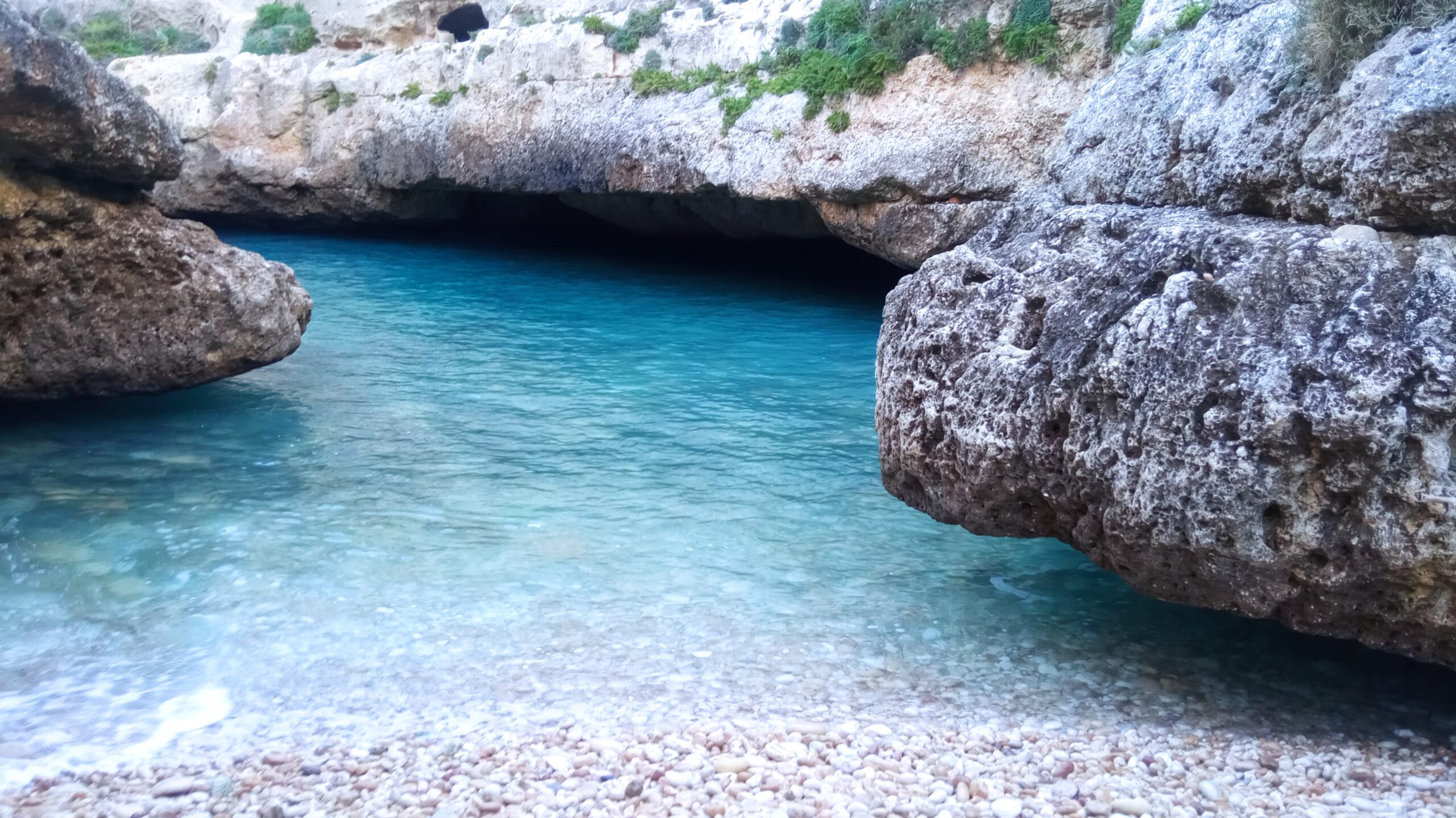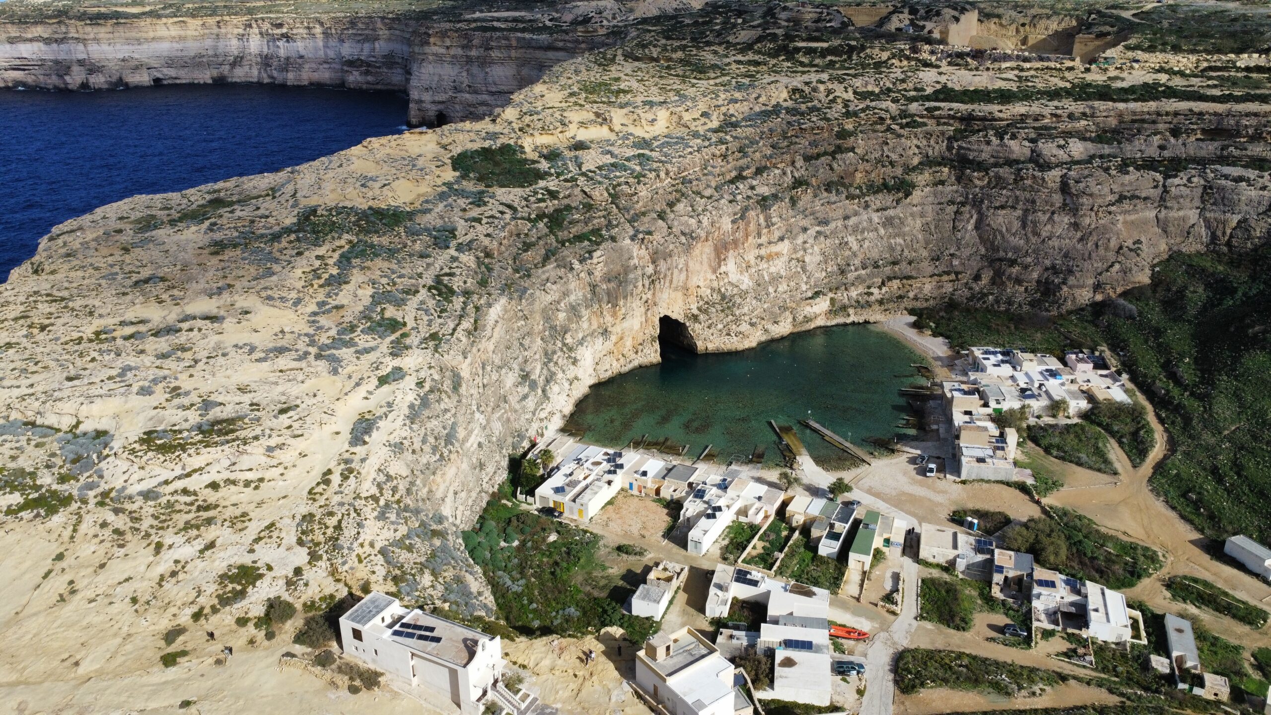 Útes je na jednom mieste penetrovaný jaskyňou na úrovni hladiny mora a tým sa otvoril priestor morskej vode, ktorá zaplavila časť pevniny. Šikovní domáci rybári to využili a na brehu okolo takto dokonalo chránenej lagúny si postavili domčeky so suchými dokmi pre svoje rybárske člny.
