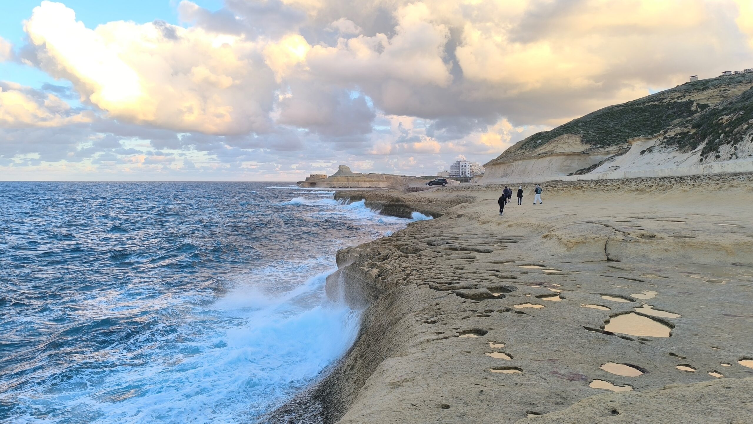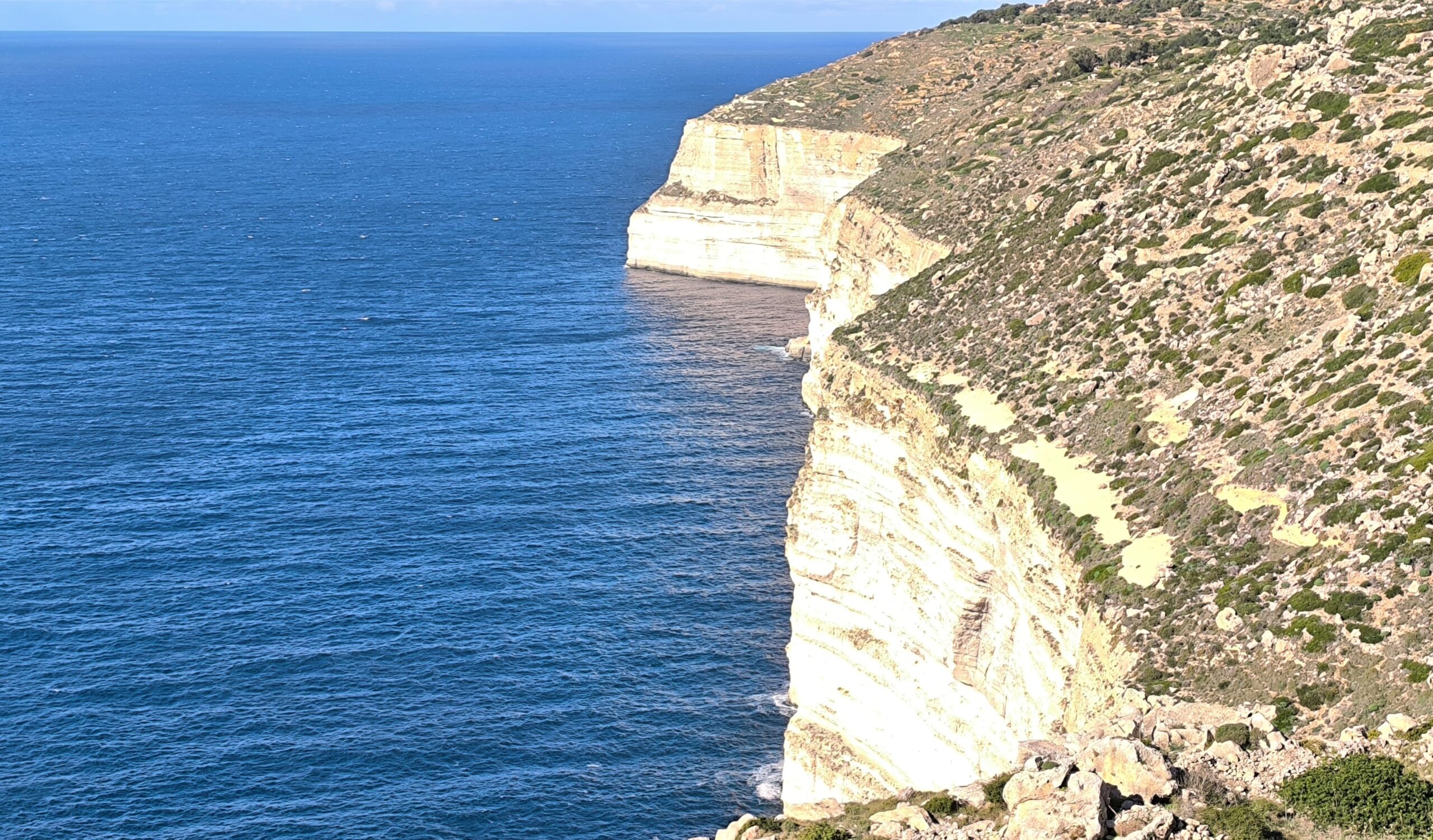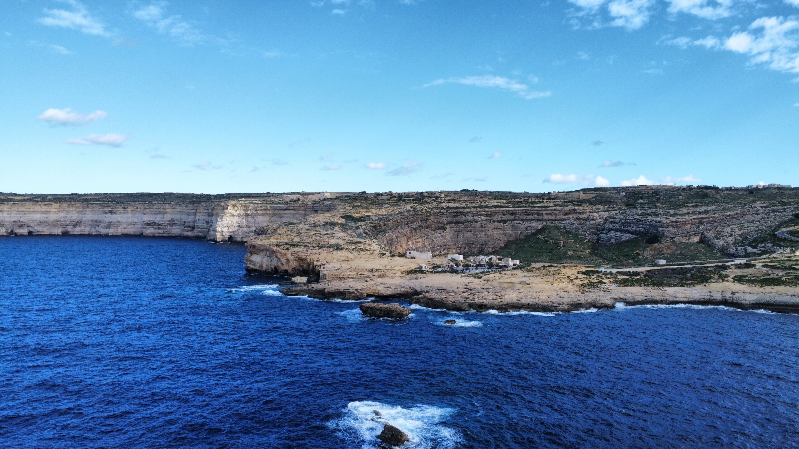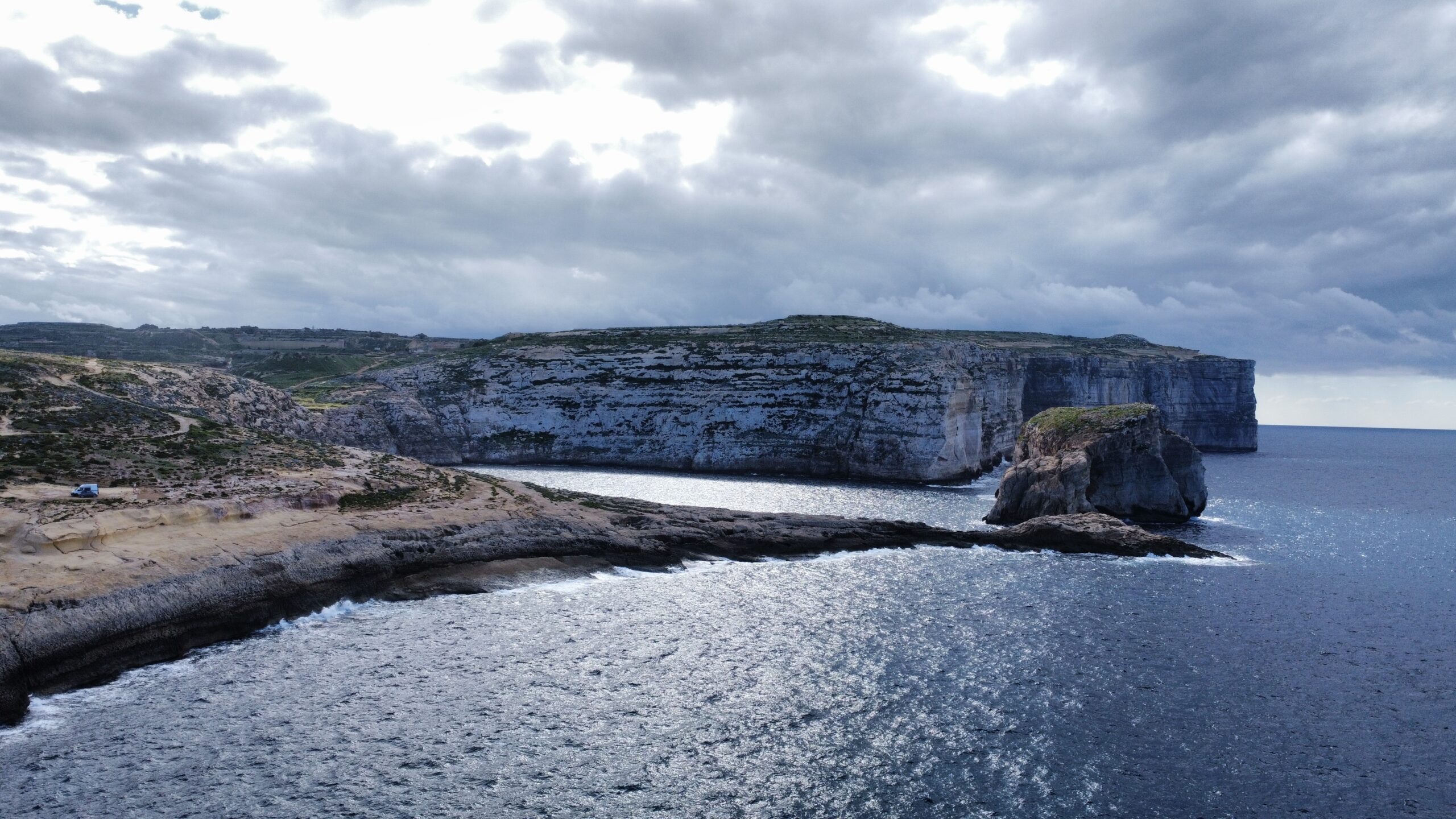 Navigácia nás však viedla ešte horšími cestami ako na Malte k tým prvým útesom a to malo za následok, že sme sa na to po nejakom čase vykašlali. Auto som odparkoval na mieste, kde bolo trochu viac miesta a útesy som odfotil aspoň z diaľky. Stále dosť fúkalo, vytiahol som však dron a riskol pár záberov zo vzduchu. Dron mal čo robiť, ale nakoniec pristál šťastlivo 🙂