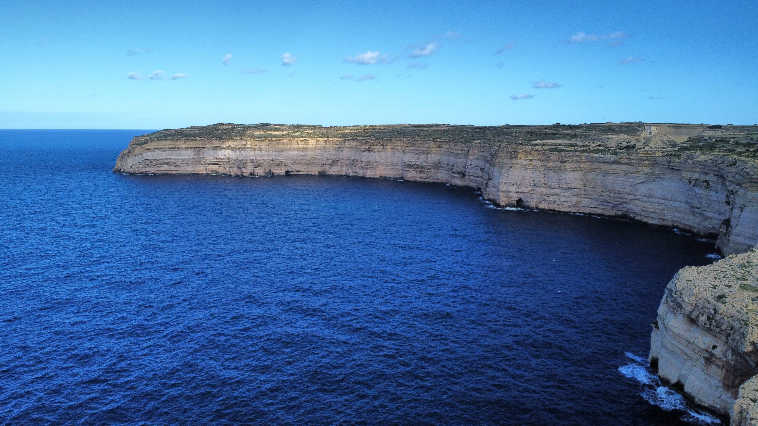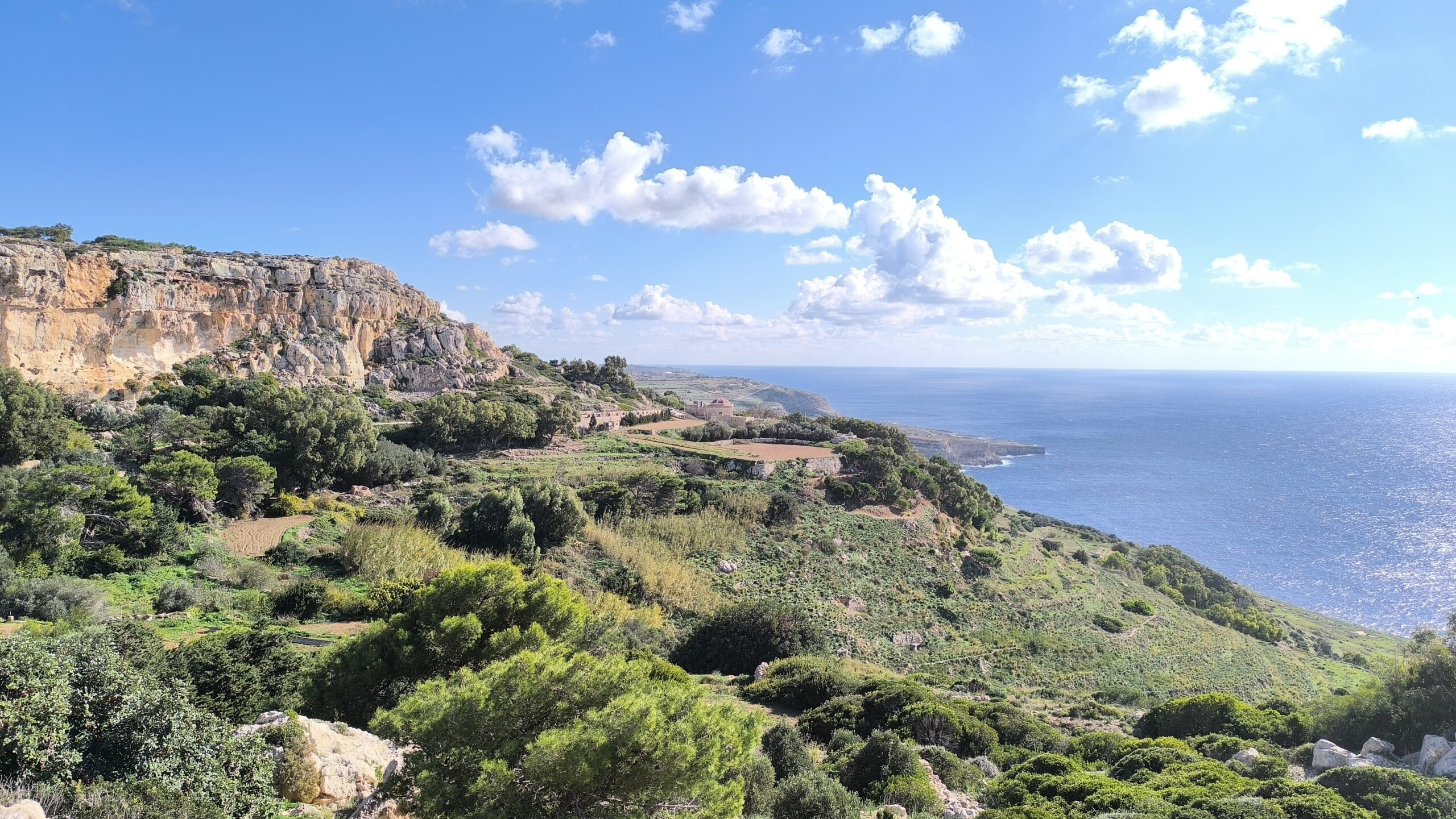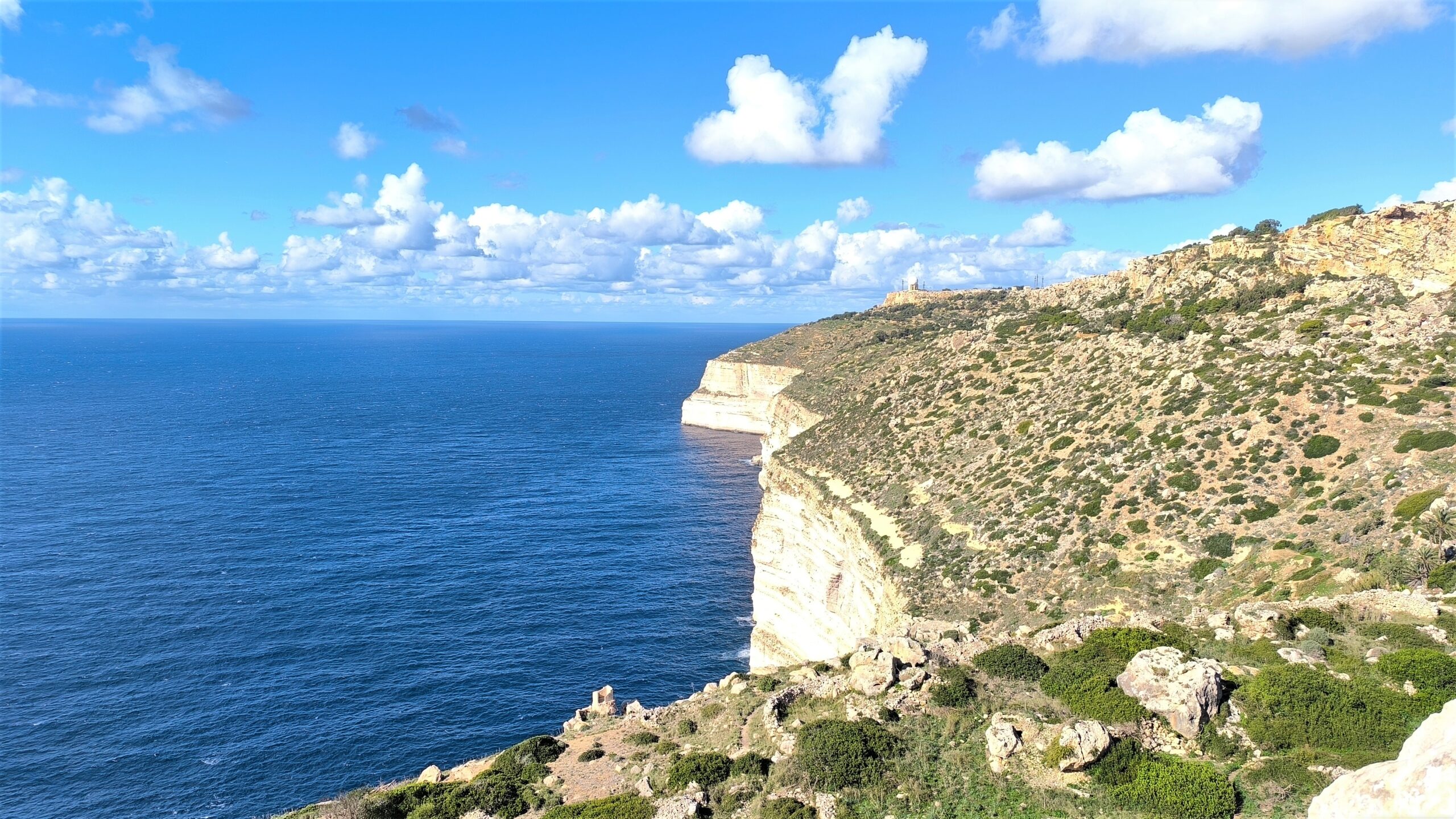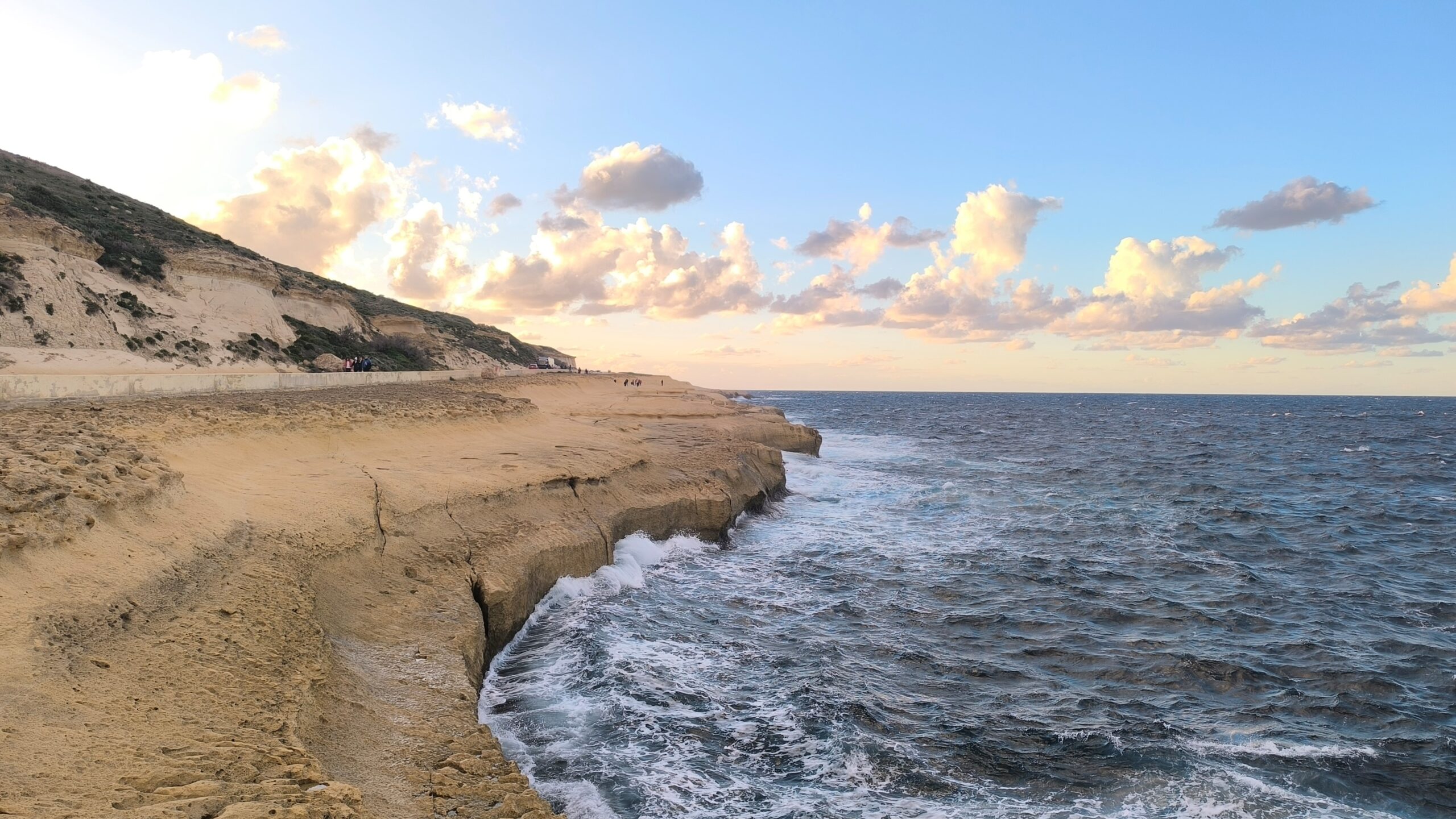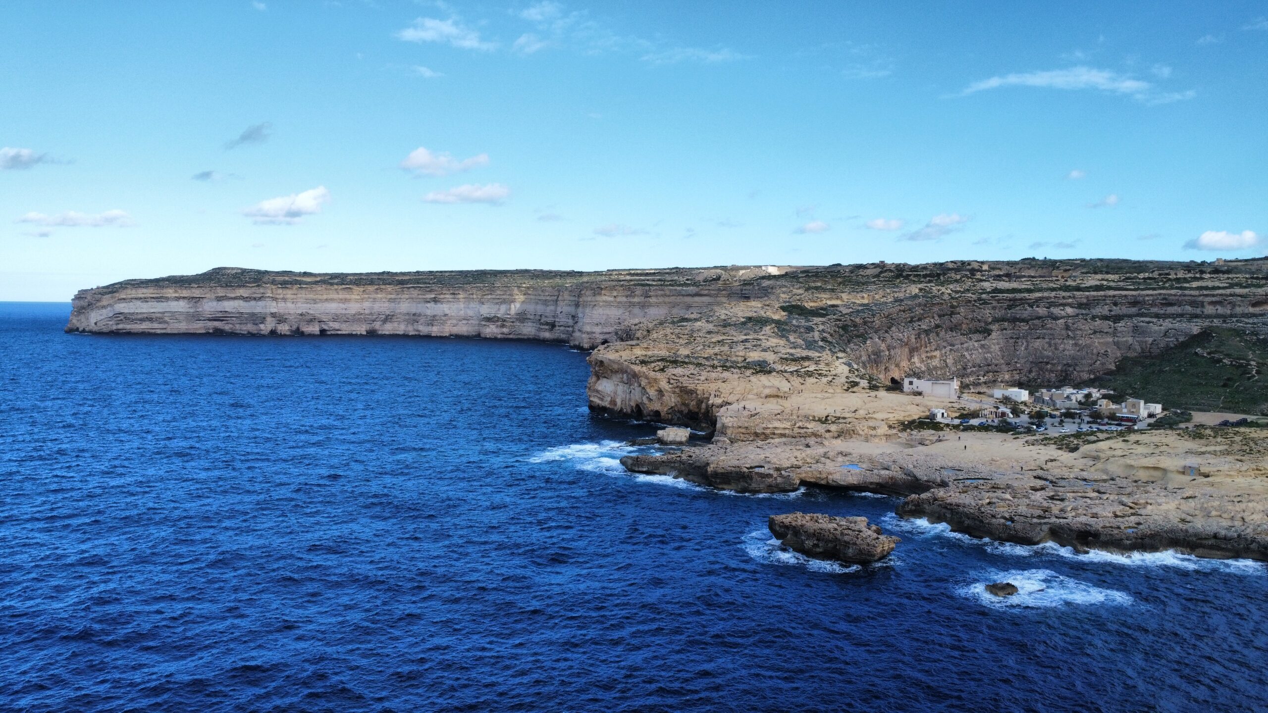 Navigácia nás však viedla ešte horšími cestami ako na Malte k tým prvým útesom a to malo za následok, že sme sa na to po nejakom čase vykašlali. Auto som odparkoval na mieste, kde bolo trochu viac miesta a útesy som odfotil aspoň z diaľky. Stále dosť fúkalo, vytiahol som však dron a riskol pár záberov zo vzduchu. Dron mal čo robiť, ale nakoniec pristál šťastlivo 🙂