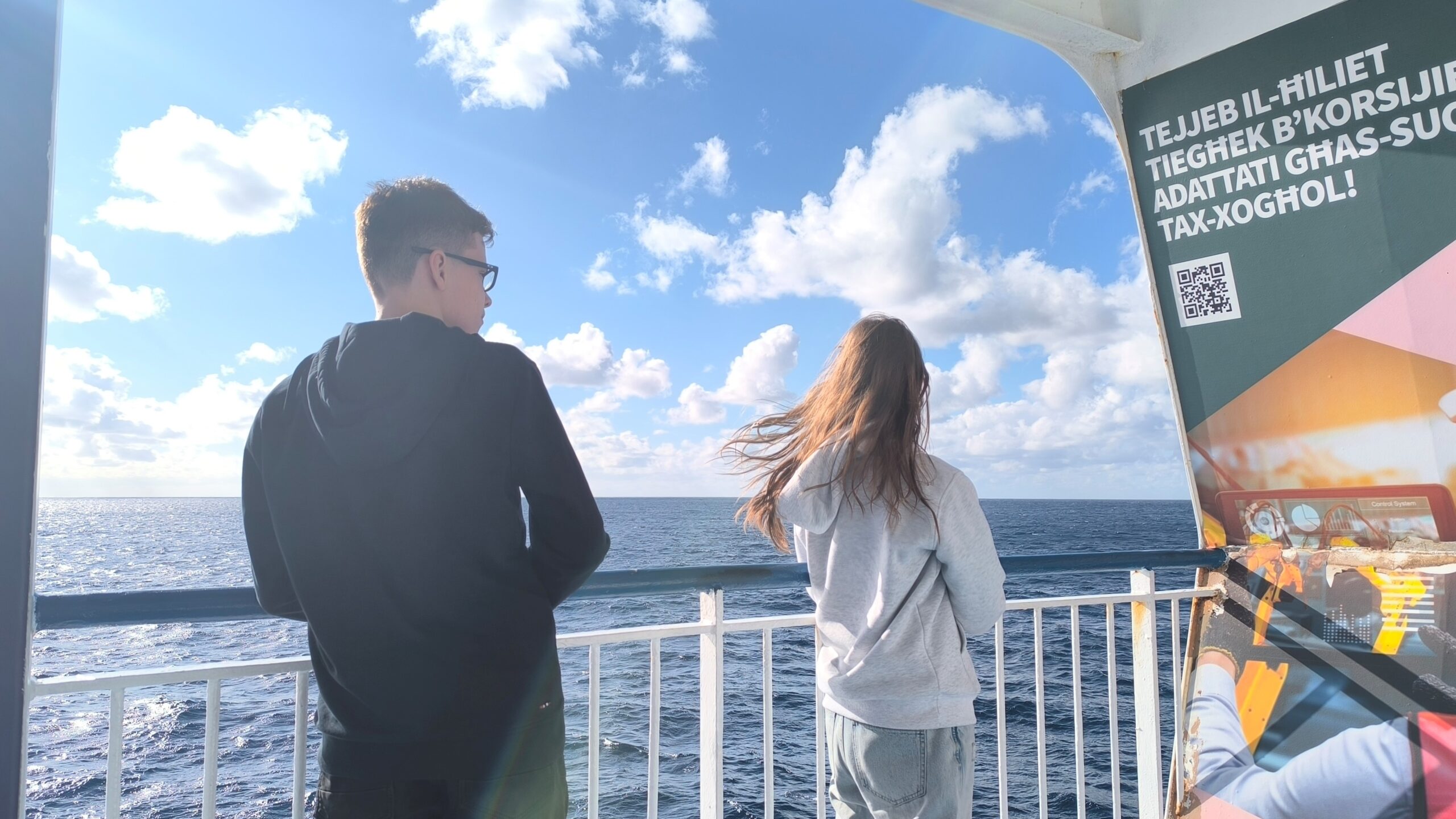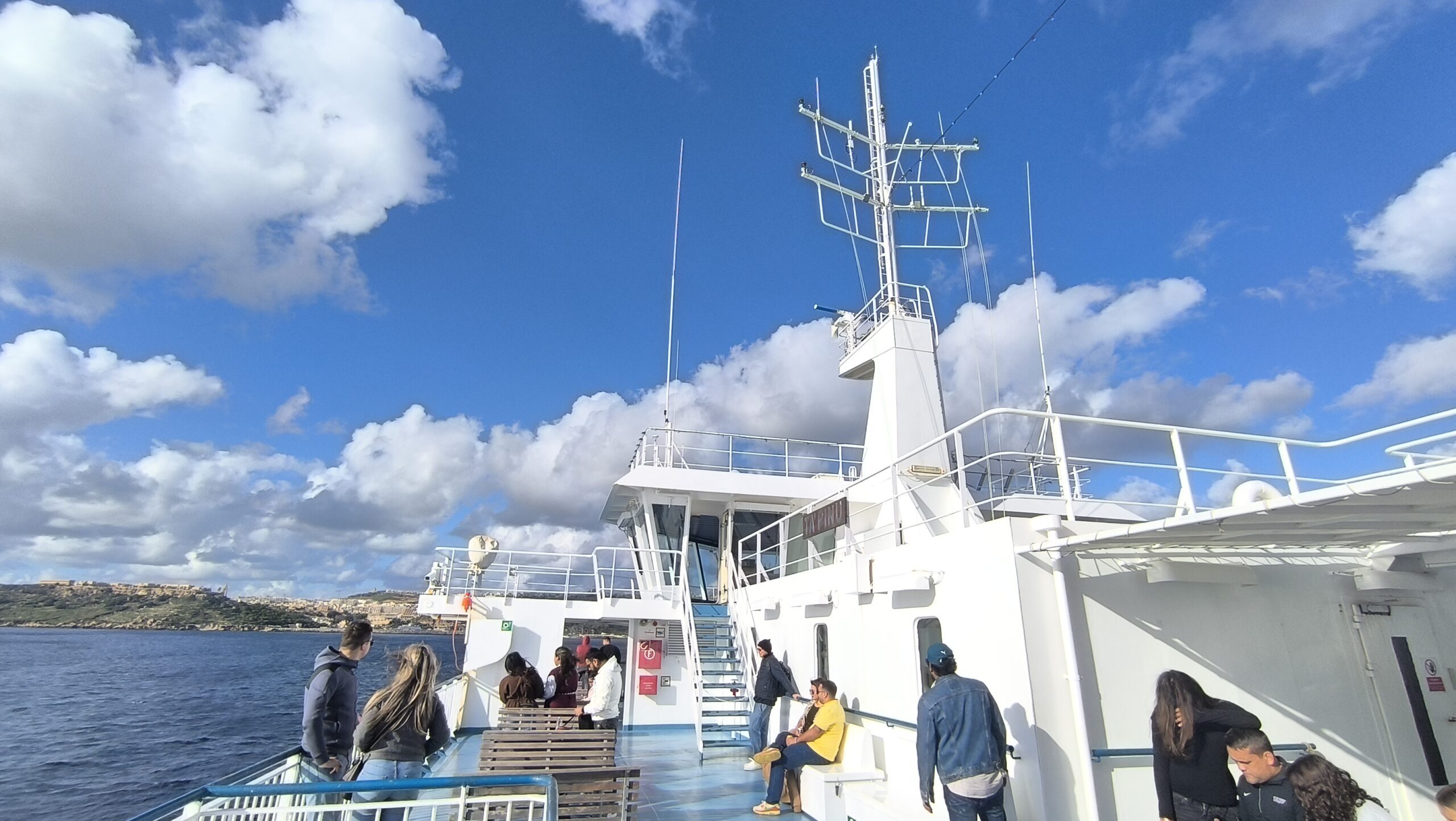 Vybehli sme hore na palubu, s Katkou sme si dali kávu, trochu sa prešli po vonku, ale fakt dosť fúkalo.