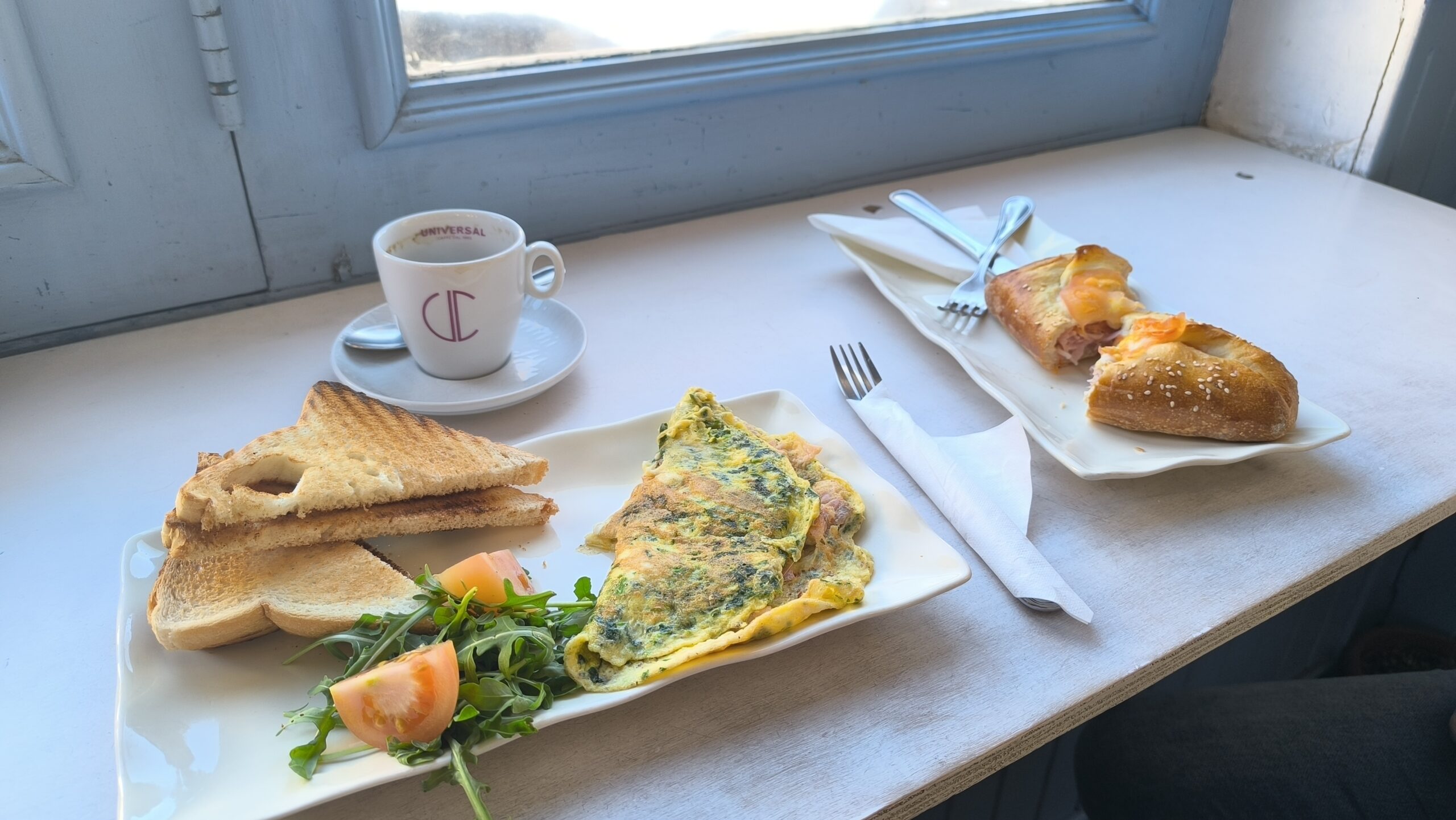 Tánička si dala palacinky s pistáciovou náplňou (mňam), Tomi klasické toasty šunka-syr, Katka buchtu so syrom a šunkou a ja omeletu s lososom a špenátom. K tomu dve výborné kávy a účet 22,-€.