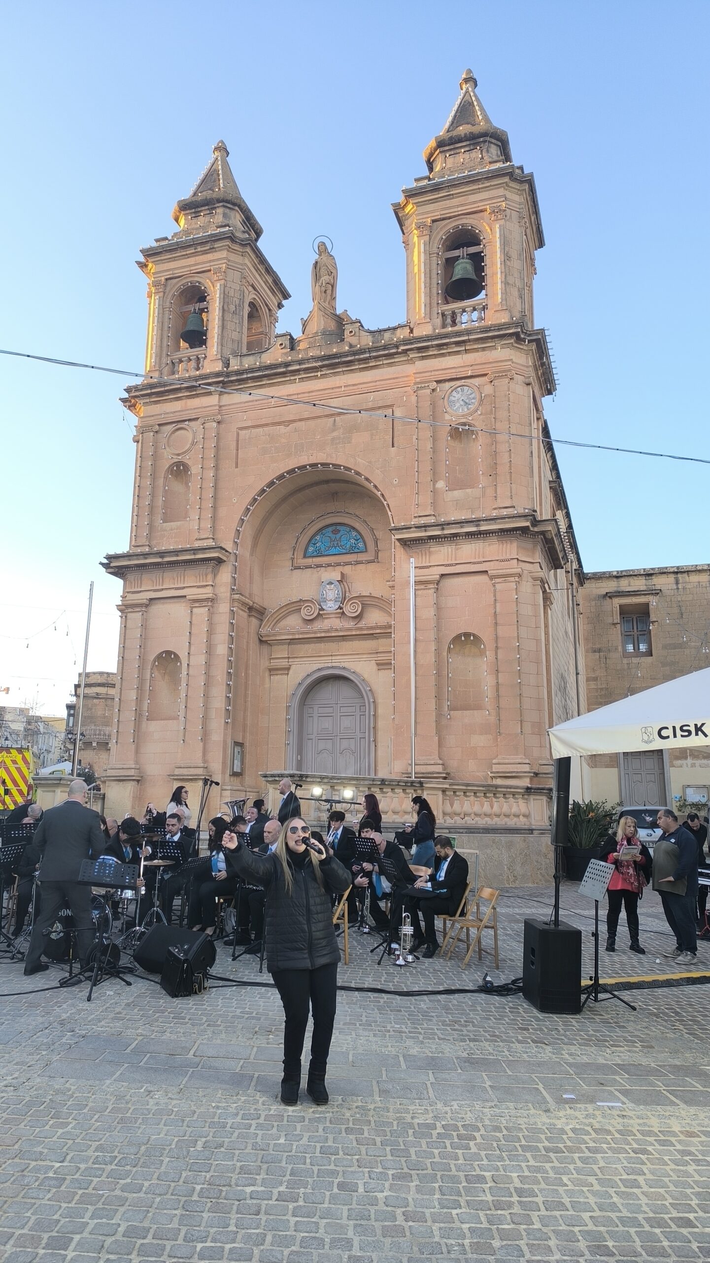 Keď slnko začalo zachádzať za obzor, pobrali sme sa späť. Na chvíľu sme sa pristavili na vianočných trhoch, kde orchester dolaďoval posledné detaily pred vystúpením. Vypočuli sme si dve cover verzie (asi) lokálnej speváčky, išlo jej to dosť dobre.